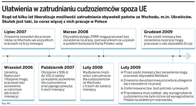 Rząd wprowadził ułatwienia w zatrudnianiu m.in. Ukraińców w II połowie 2006 roku. I stopniowo w ciągu kilku kolejnych lat rozszerzał je (patrz ramka). Spowodowały one, że przedsiębiorcy składali coraz więcej oświadczeń o zamiarze zatrudnienia cudzoziemców w Polsce.