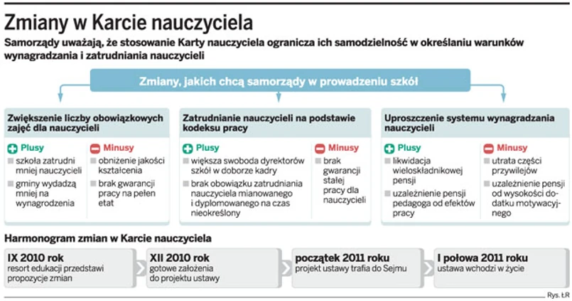 Samorządy i dyrektorzy szkół alarmują, że Karta nauczyciela ogranicza im możliwość swobodnego zatrudniania i wynagradzania pedagogów. Powoduje też nieuzasadnione koszty. Mimo że w ubiegłym tygodniu Trybunał Konstytucyjny potwierdził, że gminy muszą ją stosować, nie składają one broni. W TK są kolejne wnioski, a pod naciskiem gmin Ministerstwo Edukacji Narodowej pracuje nad nową ustawą – tzw. Kartą 2. Na razie nad zmianami pracuje zespół, do którego zostali zaproszeni m.in. samorządowcy i oświatowe związki zawodowe. Jednak, jak ustalił „DGP”, wszystko wskazuje na to, że nauczyciele stracą część przywilejów.