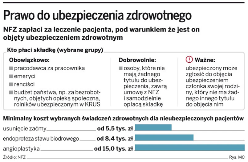Za leczenie pacjenta, który uiszcza składki zdrowotne, szpitalowi płaci NFZ. Pacjent potwierdza prawo do leczenia np. książeczką zdrowia czy drukiem ZUS RMUA. Okazuje się jednak, że mimo opłacania składki NFZ nie zawsze płaci za udzielone im świadczenia. A wtedy szpital wystawia pacjentowi rachunek.