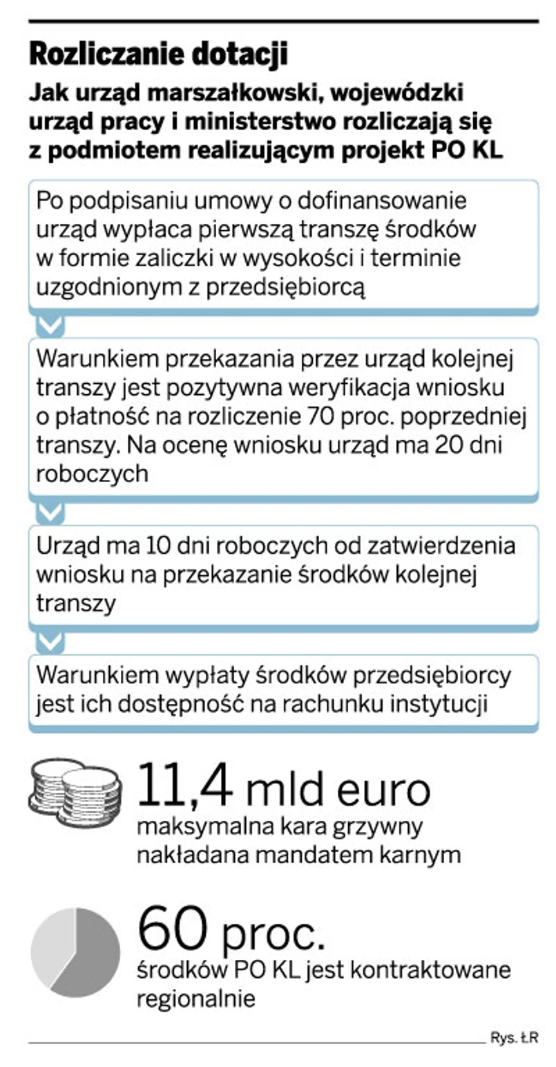 Jako pierwszy do tych zaleceń zastosował się Urząd Marszałkowski Województwa Łódzkiego (UMWŁ). Opracował zasady, jak karać przedsiębiorców za błędy. Pensję koordynatora projektu i specjalisty ds. finansowych będzie można obniżyć o 10 proc., jeśli urząd po raz trzeci odeśle wniosek do poprawki. Przy piątej korekcie zostanie ona arbitralnie zmniejszona o połowę.