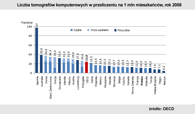 Dane z Polski mogą do końca zepsuć samopoczucie: tomografów mamy zaledwie 10,9 sztuk na milion mieszkańców, a skanerów do rezonansu magnetycznego już tylko 2,9 sztuk. Absolutny lider Japonia ma tych pierwszych przeszło 97, a tych drugich – ponad 43