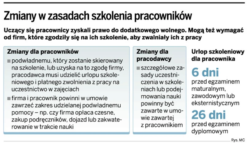 Firma, która skieruje pracownika na szkolenie lub naukę w szkole albo zgodzi się na jego udział w takich zajęciach, będzie musiała udzielić mu urlop szkoleniowy. Taki m.in. obowiązek nakłada na pracodawcę wchodząca dziś w życie ustawa z 20 maja 2010 r. o zmianie ustawy – Kodeks pracy oraz ustawy o podatku dochodowym od osób fizycznych (Dz.U. nr 105, poz. 655). Jeśli pracownik przystąpi np. do egzaminu zawodowego lub maturalnego, jego pracodawca udzieli mu sześć dni urlopu szkoleniowego. Z kolei 21 dni wolnego będzie mu przysługiwało m.in. na przygotowanie pracy dyplomowej i jej obronę.