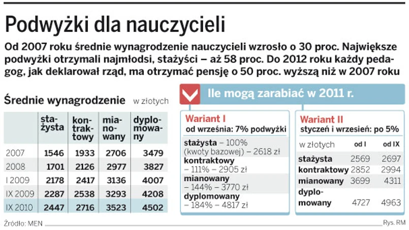 Dodaje jednak, że taki scenariusz oznacza, że rząd, chcąc wywiązać się z obietnicy podniesienia w latach 2007 – 2011 pensji nauczycieli o 50 proc., musiałby w budżecie na 2011 i 2012 rok zapisać dwie podwyżki po 10 proc.