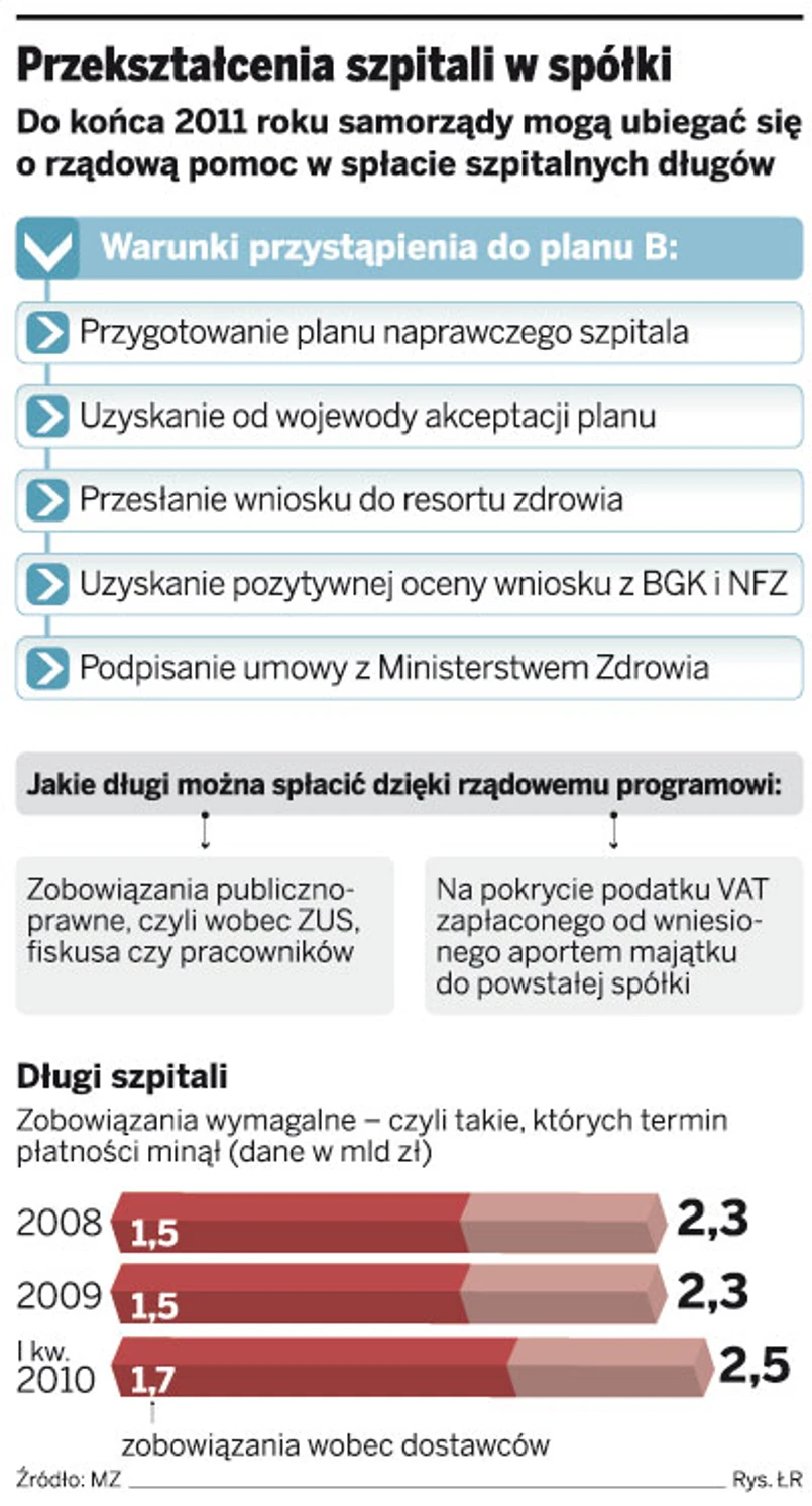 Liczba szpitali przekształcanych w spółki nie rośnie w tempie zadowalającym resort zdrowia. Co prawda w porównaniu z ubiegłym rokiem liczba wniosków samorządów o włączenie do uruchomionego w kwietniu 2009 roku rządowego programu (tzw. planu B) wzrosła, to wciąż na taki krok zdecydowało się zaledwie 60 samorządów. Tyle wniosków o spłatę z budżetu części długów szpitali już działających w formie spółek lub właśnie przekształcanych trafiło do resortu zdrowia i Banku Gospodarstwa Krajowego (BGK).