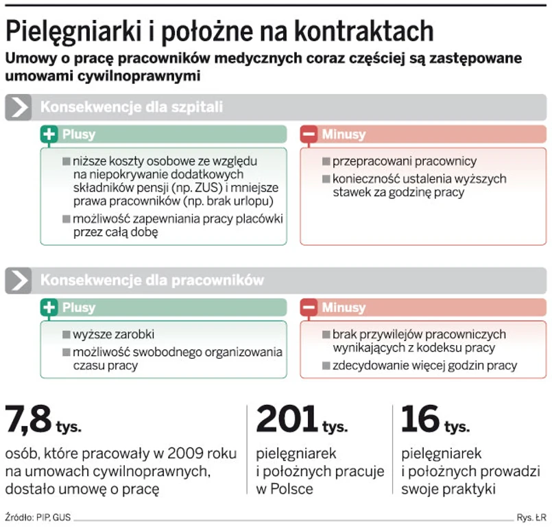Tego, czy faktycznie rośnie liczba nieprawidłowości w wykorzystywaniu tzw. kontraktów, nie jest w stanie zweryfikować ani resort zdrowia, ani Państwowa Inspekcja Pracy (PIP). Ten pierwszy nie zbiera takich danych, inspekcja natomiast ma jedynie zbiorcze dane dotyczące skarg w sprawie stosowania umów cywilnoprawnych. Nie wiadomo, ile z nich dotyczy pracowników medycznych. Faktem jest jednak, że od 2008 roku, kiedy zaczęły obowiązywać unijne przepisy dotyczące czasu pracy, m.in. ograniczenie do 40 godzin tygodniowego czasu pracy, możliwość wydłużenia pracy tylko za zgodą pracownika, w szpitalach rośnie liczba pracowników kontraktowych.