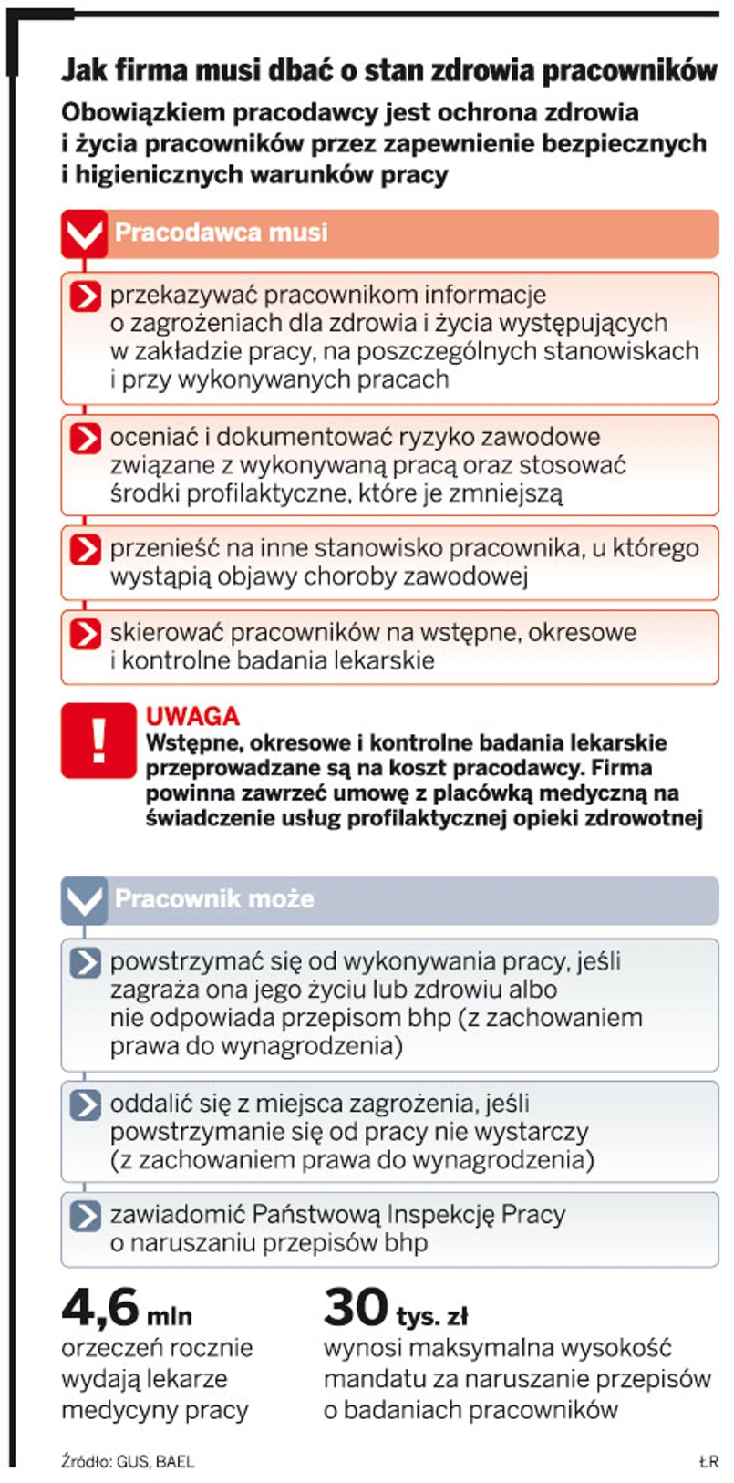 Z danych Ministerstwa Zdrowia (MZ) wynika, że 99,5 proc. podwładnych pozytywnie przechodzi badania lekarskie dopuszczające ich do pracy. W ubiegłym roku lekarze medycyny pracy przeprowadzili wizytację zaledwie w 2 proc. firm, choć mają oni m.in. oceniać zagrożenie występujące na danym stanowisku pracy.