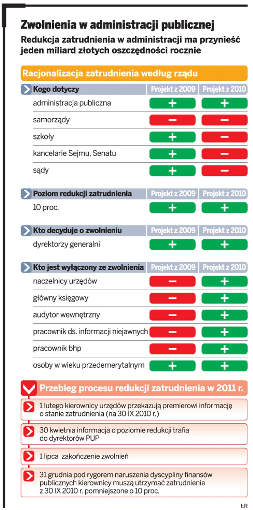 Zwolnienia, w odróżnieniu od propozycji w projekcie ustawy o racjonalizacji zatrudnienia z 2009 roku, nie muszą objąć m.in. pracowników Kancelarii Sejmu, Senatu czy Prezydenta. Jeżeli jednak ich szefowie zdecydują o zmniejszeniu liczby swoich pracowników, to mogą skorzystać z tak zwanej szybkiej ścieżki.