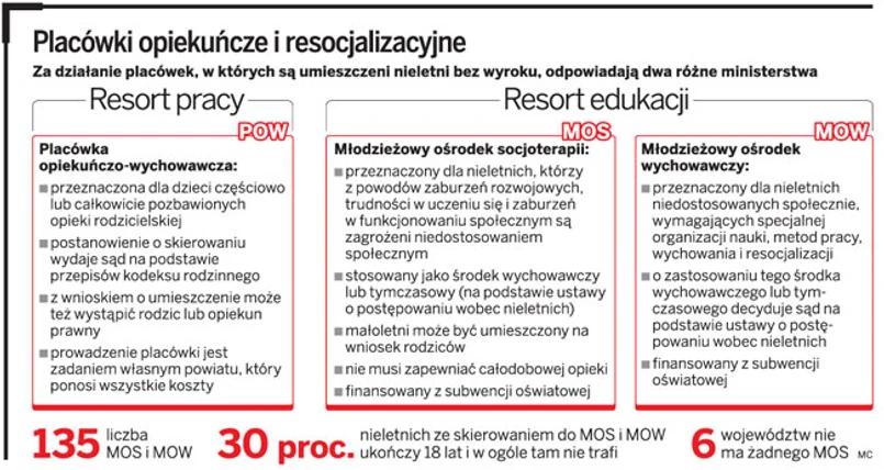 Coraz częściej też do MOS lub MOW trafiają wychowankowie domów dziecka. W niektórych placówkach, wg danych resortu edukacji, nawet 30 proc. stanowią nieletni, którzy wcześniej tam przebywali. Zdaniem Magdaleny Arczewskiej potwierdza to niską jakość prowadzonych w domach dziecka zajęć opiekuńczo-wychowawczych, skoro dochodzi do takiej demoralizacji wychowanka, że trzeba go umieścić w placówce o zaostrzonym rygorze.
