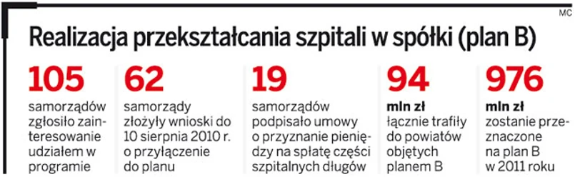 Poza tym z rządowej pomocy w spłacie szpitalnych długów (tzw. plan B) będą mogły skorzystać również te samorządy, których placówki nie mają co prawda długów wobec np. ZUS, ale zalegają z zapłatami kontrahentom. Obecnie są one wykluczone z możliwości skorzystania z rządowego planu B.