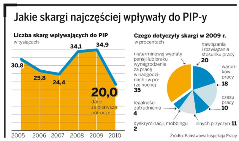 Ponad dwie trzecie skarg dotyczy właśnie problemu z wypłatą. Ale pracownikom doskwierają też inne nadużycia. Walczą o zaległe urlopy, a w czasie upałów skarżą się na brak klimatyzacji. Cztery lata temu wszystkich skarg zgłoszonych do PIP było niecałe 25 tys, a w pierwszej połowie tego roku ich liczba przekroczyła 20 tys. – Wzrosła świadomość prawna pracowników. Na to nałożył się kryzys – mówi Rutkowska. Na skargę częściej decydują się osoby, które odchodzą z firmy. Znacznie rzadziej ci nadal tam zatrudnieni. Każdy, kto zgłosi nadużycie PIP, ma zagwarantowaną anonimowość.
