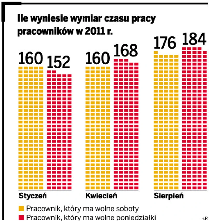 Na przykład jeśli rozkład czasu pracownika przewiduje, że jego dniem wolnym z tytułu pięciodniowego tygodnia pracy jest sobota, to na podstawie nowych przepisów jego wymiar czasu pracy w styczniu 2011 r. wyniesie 160 godzin.