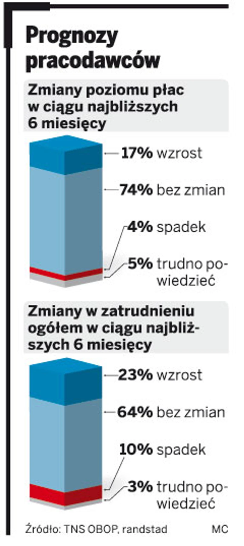 Ożywienie na krajowym i europejskim rynku pracy nie oznacza jednak automatycznego wzrostu wynagrodzeń. Aż 74 proc. przedsiębiorców nie przewiduje podwyżek w ciągu najbliższych sześciu miesięcy. Chcą inwestować w szybką odbudowę mocy wytwórczych, które musieli mocno ograniczyć w czasie kryzysu. Niewykluczone jednak, że rosnąca fala emigracji zarobkowej za granicę skłoni ich do podwyżek.