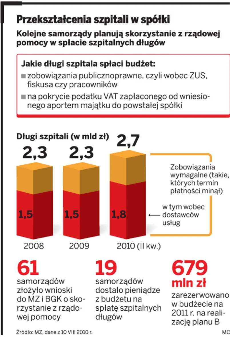 Nie ma jednak pewności czy powiat zdąży skorzystać z rządowego planu B, bo resort zdrowia nie wyklucza jego wygaśnięcia. Tak się stanie, jeżeli w życie wejdzie ustawa o działalności leczniczej. Projekt w tej sprawie jest właśnie konsultowany. W październiku ma trafić do Sejmu. Rząd przewiduje, że jej przepisy zaczną obowiązywać w 2011 roku. Nie oznacza to jednak, że rząd rezygnuje z pomocy w spłacie zobowiązań przekształcanych szpitali. Będzie dalej to robił, ale na zmodyfikowanych zasadach. Samorządowcy obawiają się jednak, że mogą być one mniej korzystne w porównaniu ze zmianami, jaki wcześniej zapowiadał resort zdrowia. Ten planował bowiem, że tak rozszerzy działanie planu B, żeby mogło z niego korzystać więcej samorządów.