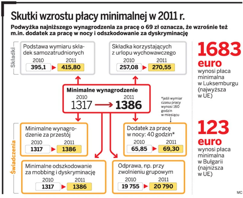 Z płacą minimalną powiązana jest wysokość wielu innych świadczeń pracowniczych i zobowiązań, jakie muszą opłacać przedsiębiorcy. Pracodawcy powinni wręczyć aneksy do umów o pracę tym podwładnym, którzy pracują za najniższą stawkę obowiązującą w 2010 roku (1317 zł). Od przyszłego roku muszą oni zarabiać co najmniej 1386 zł. Zmieni się także wysokość m.in. dodatku za pracę w nocy oraz maksymalna kwota odpraw dla pracowników objętych grupowym zwolnieniem (lub indywidualnym, jeśli przyczyna zwolnienia nie dotyczyła pracownika), a także minimalna wartość odszkodowania za dyskryminację w zatrudnieniu lub mobbing.