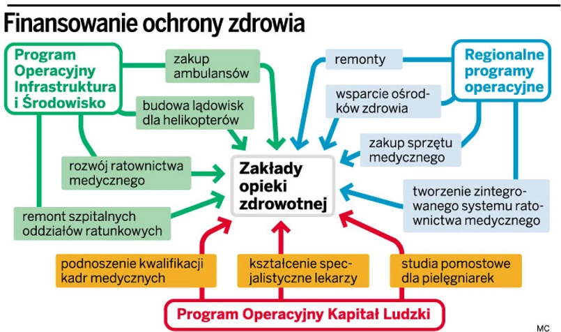 Polskie placówki medyczne, w tym przede wszystkim te założone i zarządzane przez jednostki samorządu terytorialnego bardzo chętnie ubiegają się o dofinansowanie europejskie. Łącznie z budżetu Unii Europejskiej na inwestycje do zakładów opieki zdrowotnej trafiło już prawie 3 mld zł. Środki te pochodziły z Programu Operacyjnego Infrastruktura i Środowisko (PO IiŚ) oraz regionalnych programów operacyjnych (RPO). Szpitale za pieniądze z Unii Europejskiej głównie powiększają swoje zaplecze techniczne, prowadzą remonty, budują lądowiska dla helikopterów, kupują nowoczesny sprzęt i ambulanse. Problem w tym, że unijne dotacje przyznane Polsce do 2013 roku się kończą, a potrzeby służby zdrowia nie zostały zrealizowane nawet w połowie.