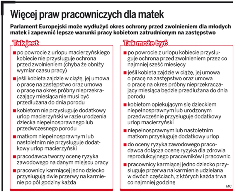 W przypadku urodzenia wcześniaka lub dziecka niepełnosprawnego kobieta ma zyskać dodatkowy urlop macierzyński. Może on przysługiwać także niepełnosprawnej lub nastoletniej matce. Każda pracownica ma też zyskać lepszą ochronę przed zwolnieniem – będzie ona przysługiwać przez sześć miesięcy od powrotu do pracy z urlopu macierzyńskiego. Matka miałaby też prawo do dwóch godzinnych przerw na karmienie dziecka, a nie jak obecnie dwóch przerw po pół godziny. To jedne z najważniejszych propozycji, jakie zawiera projekt zmiany unijnej dyrektywy w sprawie kobiet w ciąży powracających do pracy po urodzeniu dziecka i karmiących. Jeśli wejdzie w życie, Polska będzie musiała wdrożyć nowe rozwiązania.
