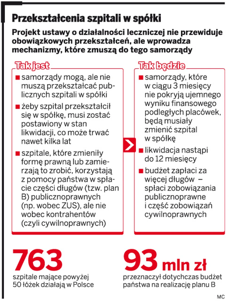 Projekt ustawy o działalności leczniczej bardzo ostro skrytykowali również rektorzy uczelni medycznych, do których należą szpitale kliniczne. Te bowiem, jak proponuje resort zdrowia, mają także przekształcać się w spółki (obecnie nie mogą tego robić). Jeżeli akademia nie pokryje w ciągu 3 miesięcy ujemnego wyniku finansowego kliniki, to będzie ona miała 12 miesięcy na jego przekształcenie w spółkę.