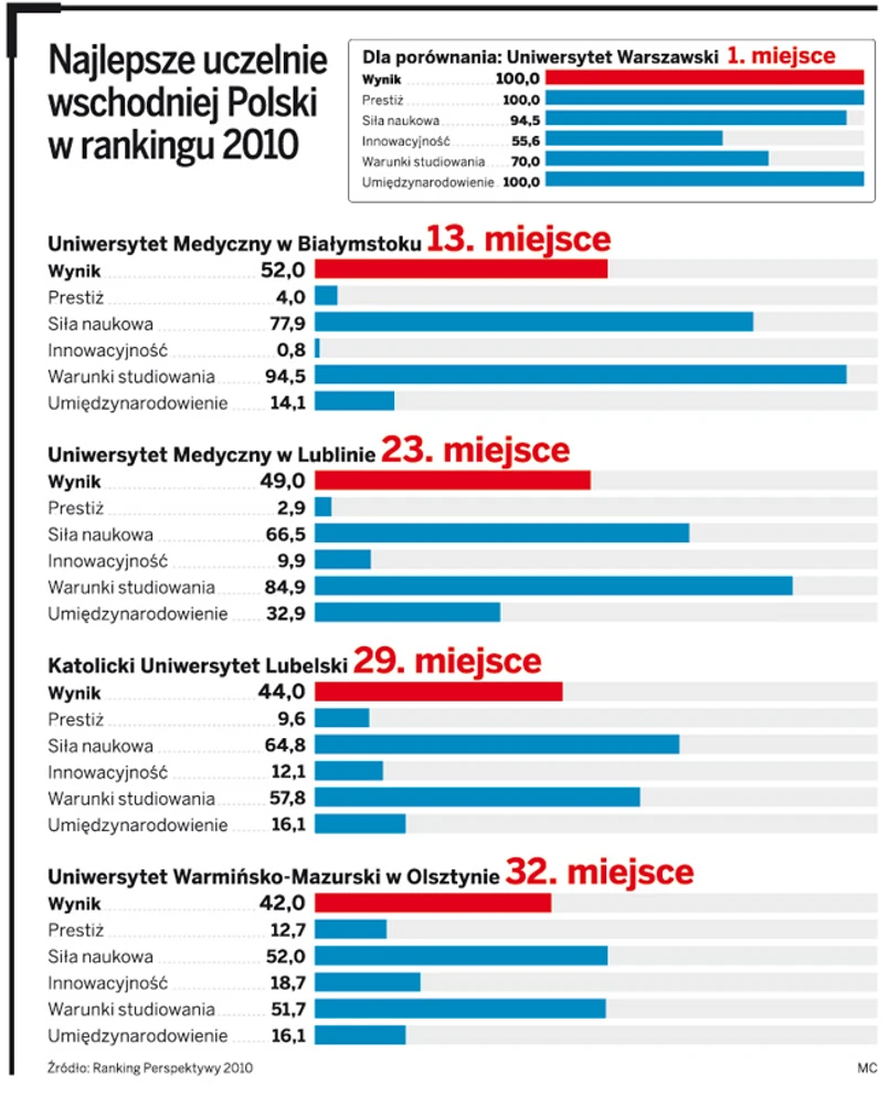 Uczelnie Polski Wschodniej walczą o wyższe miejsca w rankingach, bo przekłada się ono na to, że więcej osób chce w takiej szkole studiować i robić karierę naukową. Kryteria, które decydują o miejscu w rankingu, to m.in. warunki studiowania, wymiana studencka, ocena kadry naukowej czy programy studiów w językach obcych. Dlatego, by przyciągnąć studentów, uczelnie te starają się o pieniądze ze środków unijnych. Ponad 137 mln zł otrzymał Uniwersytet w Białymstoku.