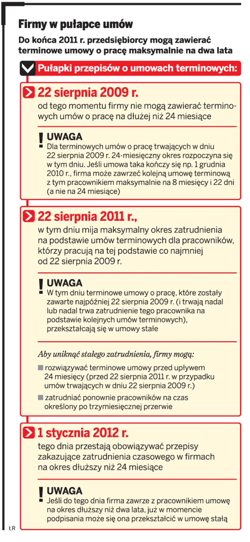 Przepisy ustawy antykryzysowej dotyczące umów na czas określony mogą wywołać szczególnie drastyczne skutki w 2011 r. 22 sierpnia 2011 r. upłyną bowiem dwa lata od momentu wejścia ich w życie. Umowy terminowe, które trwają w tym dniu, a zostały zawarte najpóźniej 22 sierpnia 2009 r., mogą przekształcić się wówczas w umowy na czas nieokreślony (upłynie bowiem dwuletni okres ich obowiązywania). Podobnie w stałe kontrakty mogą przekształcić się w tym dniu także kolejne umowy zawierane z takimi pracownikami (o ile przerwy pomiędzy poszczególnymi umowami nie trwały dłużej niż trzy miesiące). Do końca 2011 r. umowy na czas nieokreślony będą też przekształcać się kontrakty zawierane od 22 sierpnia 2009 r. do końca 2009 r.
