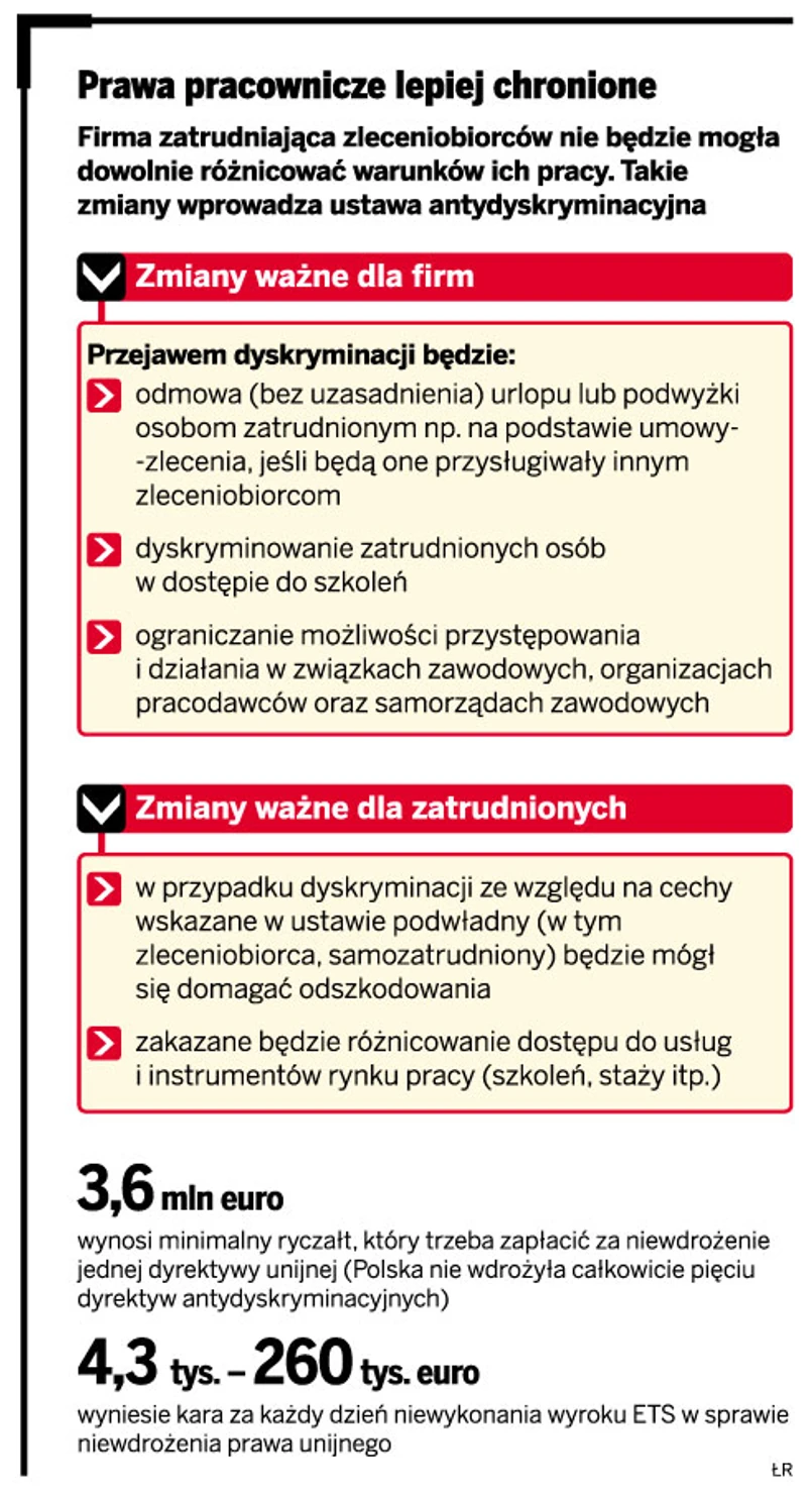 Korzystające z ich usług firmy nie będą mogły np. dowolnie ustalać wysokości wynagrodzenia poszczególnych zleceniobiorców lub przyznawać wybranym urlopy wypoczynkowe. Zakazana zostanie bowiem dyskryminacja osób zatrudnionych na tej podstawie m.in. ze względu na wiek, płeć, wyznanie czy orientację seksualną. Tak przewiduje ustawa o równym traktowaniu (ustawa o wdrożeniu niektórych przepisów Unii Europejskiej w zakresie równego traktowania).