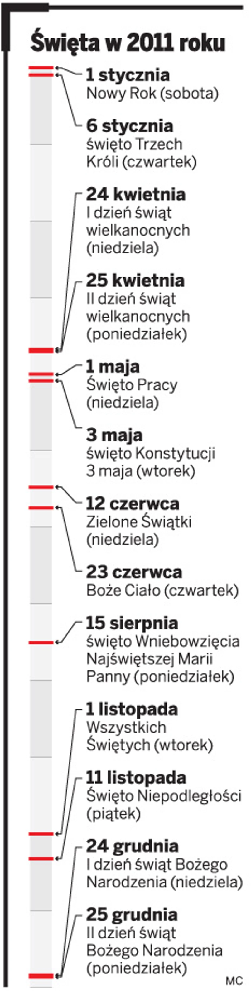 W takim przypadku w 2011 roku pracownicy zyskają jeden dzień wolny z tytułu święta Trzech Króli, ale stracą cztery z tytułu innych świąt – Nowego Roku, drugiego dnia Wielkanocy, Święta Wniebowzięcia Najświętszej Marii Panny i drugiego dnia Bożego Narodzenia.