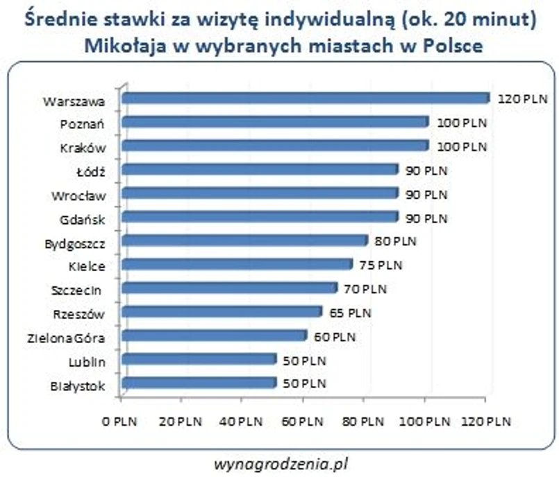W mniejszych miastach jak Lublin czy Białystok przeciętne wynagrodzenie za wizytę to ok. 50 zł. Trzeba jednak zaznaczyć, że w każdej z uwzględnionych przez nas miejscowości rozrzut stawek za usługi mikołajowe jest znaczny. W Warszawie można znaleźć ogłoszenia już za 50 zł, ale są i takie, w których cena znacznie przekracza 300 zł.