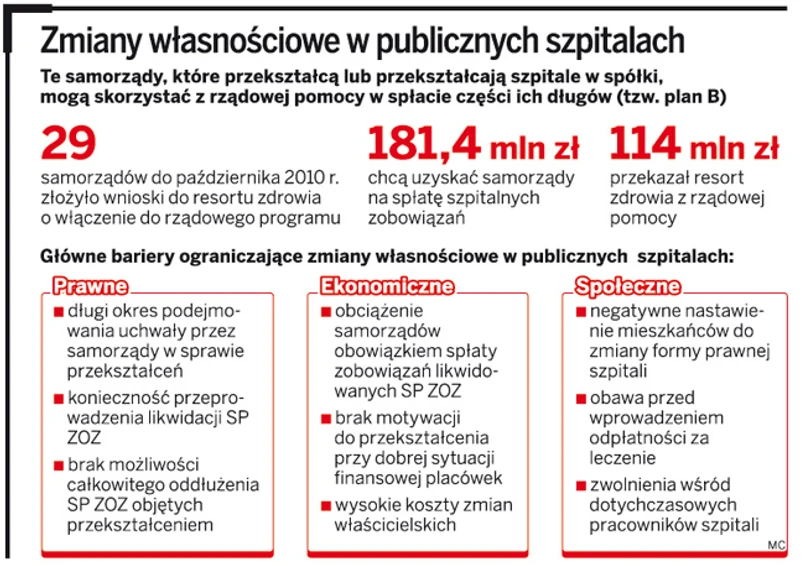 Na razie z rządowego programu (tzw. plan B), który miał zachęcać nieprzekonanych do przekształceń w zamian za spłatę części zobowiązań szpitali, nie można nazwać sukcesem. Od końca kwietnia 2009 roku, kiedy program ruszył, do 20 października tego roku do resortu zdrowia wpłynęło od samorządów zaledwie 29 wniosków o chęci przystąpienia do przekształceń.