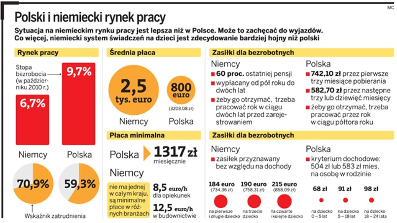 Dodaje, że stawki oferowane niemieckim specjalistom mogą nie dotyczyć Polaków. O wiele bardziej zatrudnieniem w Niemczech będą zainteresowani na przykład elektrycy, kelnerzy czy opiekunki. Dlatego że w Polsce zarabiają nawet czterokrotnie mniej. A wystarczy, że będą znali kilka podstawowych zwrotów po niemiecku i trochę angielskiego.