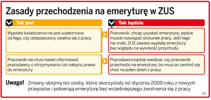 Powodem zamieszania jest uchwalona przez Sejm ustawa z 16 grudnia 2010 r. o zmianie ustawy o finansach publicznych oraz niektórych innych ustaw (czeka na podpis prezydenta). Wprowadza ona zmiany w ustawie z 17 grudnia 1998 r. o emeryturach i rentach z Funduszu Ubezpieczeń Społecznych (t.j. Dz.U. z 2009 r. nr 153, poz. 1227 z późn. zm.). Zgodnie z nimi ZUS zawiesi prawo do emerytury bez względu na wiek i wysokość przychodów, jeśli osoba uprawniona do emerytury nie zwolni się z pracy. Osoby, które złożą wnioski przed 1 stycznia 2011 r. (czyli przed dniem wejścia w życie nowych przepisów), chcąc zachować prawo do emerytury, będą musiały do końca września rozwiązać umowę z firmą.