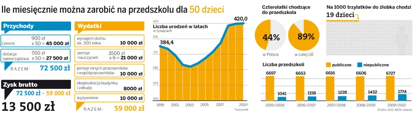 Do zakładania niepublicznych placówek zachęca rosnąca liczba urodzeń. W zeszłym roku w Polsce urodziło się 420 tys. dzieci – najwięcej od 1996 roku. A Polacy coraz chętniej oddają pociechy pod opiekę, a sami wracają do pracy.