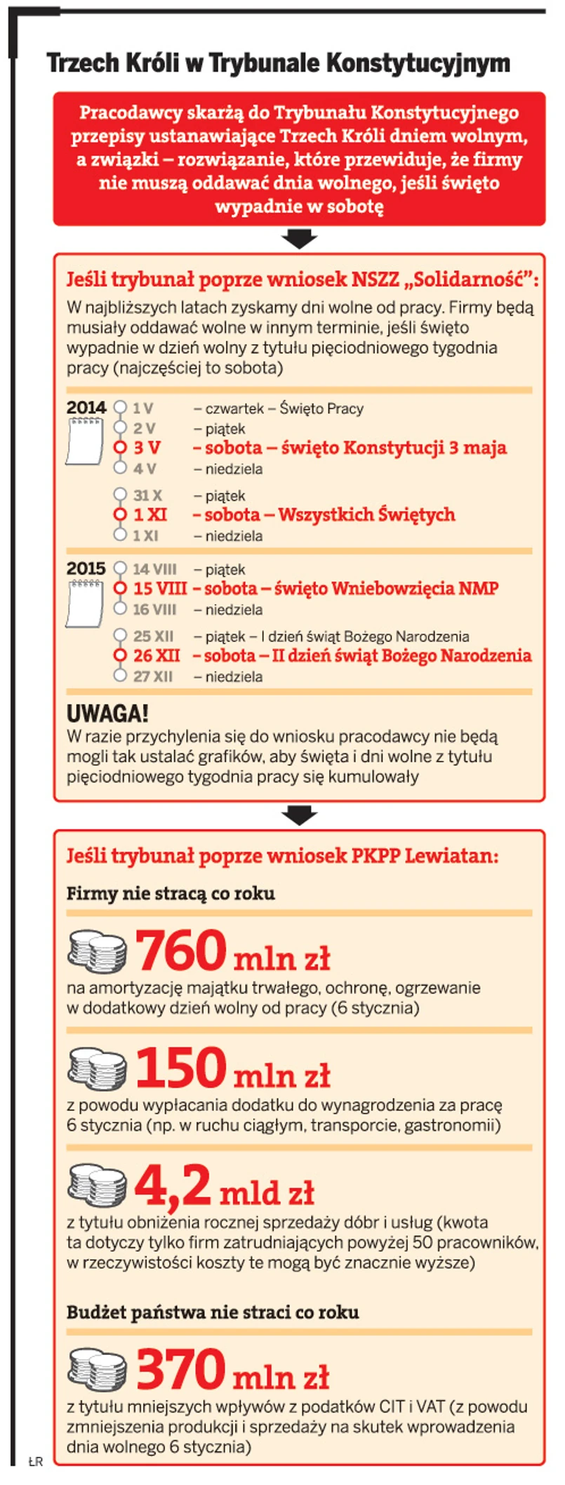 Wiele wskazuje więc, że jeszcze tylko w przyszłym roku święto Trzech Króli będzie dniem wolnym. Ale bardzo prawdopodobne jest także przywrócenie od 2013 r. zasady, że firma oddaje pracownikom wolne w innym terminie, jeśli święto wypadnie w dzień wolny dla pracownika z tytułu pięciodniowego tygodnia pracy (najczęściej jest to sobota). Wniosek w tej sprawie do TK skieruje NSZZ „Solidarność”.