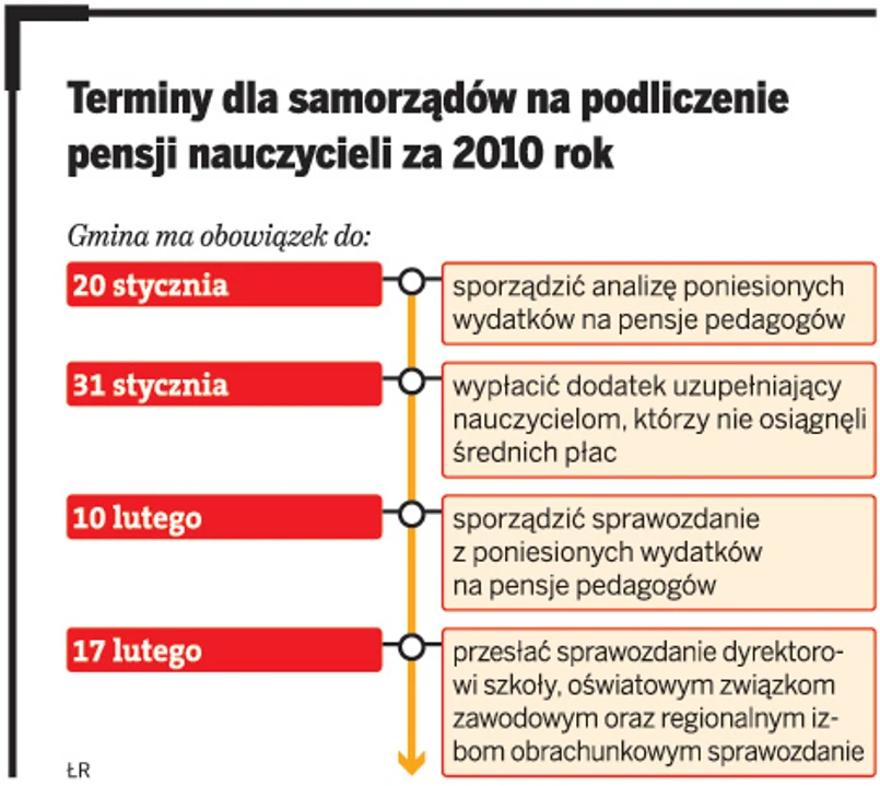 Samorządy muszą przestrzegać terminów określonych w KN, które dotyczą wypłacenia wynagrodzeń nauczycielom. Jeśli ich nie dochowają, mogą się narazić np. na zarzut naruszenia dyscypliny finansów. Wszystkie samorządy musiały do 20 stycznia przeprowadzić analizę wydatków na wynagrodzenia nauczycieli, a tym, którzy nie osiągnęli średnich płac zagwarantowanych w ustawie, do 31 stycznia wypłacić dodatek uzupełniający.