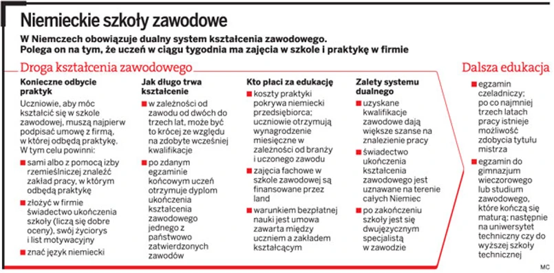 Nauka w niemieckich szkołach zawodowych odbywa się w tzw. systemie dualnym. Polega on na tym, że uczeń przez dwa – trzy dni w tygodniu ma praktykę w firmie, a pozostałe spędza w szkole. Zakład pracy płaci mu wynagrodzenie miesięczne i składki ubezpieczeniowe. Waha się ono, jak poinformowała nas frankfurcka Izba Rzemieślnicza, w zależności od branży i zawodu od 200 do 600 euro w pierwszej klasie. Wynagrodzenie w kolejnych klasach jest wyższe. Na przykład murarz w drugiej klasie otrzyma 727 euro, a w trzeciej klasie 919 euro, a na przykład stolarz odpowiednio 420 i 490 euro. Szkoła jest dla ucznia bezpłatna, finansuje ją land, pod warunkiem że uczeń zawarł umowę z kształcącym go zakładem.