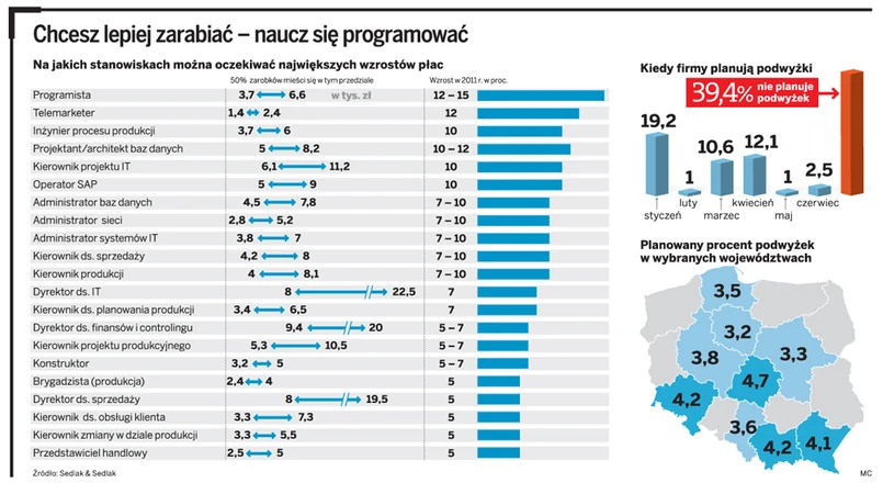 Bo jeśli chodzi o branże, na największy wzrost wynagrodzeń, podobnie jak w ubiegłym roku, mogą liczyć specjaliści z branży IT. Tu średnia deklarowana podwyżka wynosi aż 10 – 15 proc. – To oznacza, że jeśli w ubiegłym roku student znający języki programowania Java, C, C# i C++ na starcie dostawał 5 tys. zł, to w tym może oczekiwać przynajmniej 5,5 tys. zł – mówi Przemysław Gacek, prezes Grupy Pracuj, do której należy serwis Pracuj.pl.
