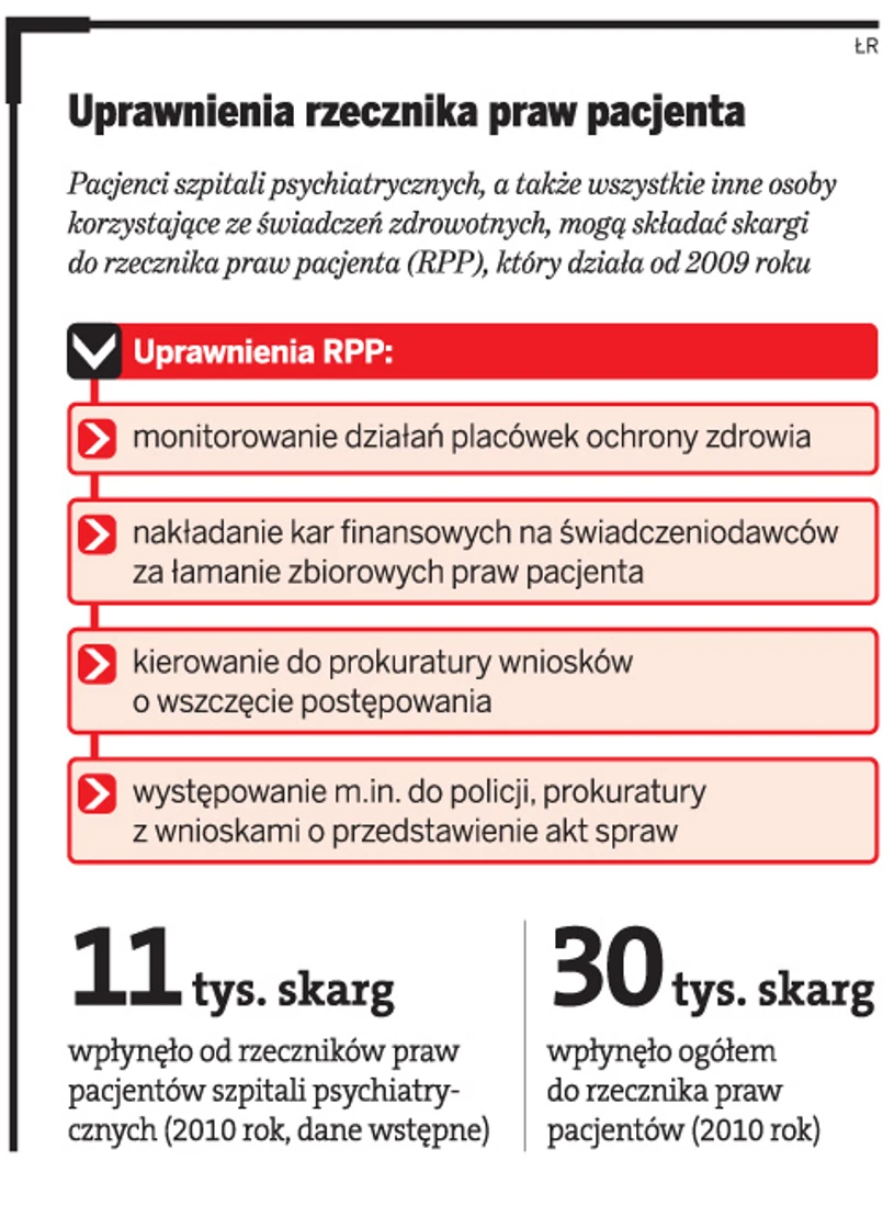 Sytuacji tych pacjentów nie poprawia też fakt, że rzeczników praw pacjentów szpitali psychiatrycznych wciąż jest ich za mało. Obecnie działa 26 rzeczników, a powinno być 50. W efekcie nie zawsze są w stanie dotrzeć do wszystkich chorych.