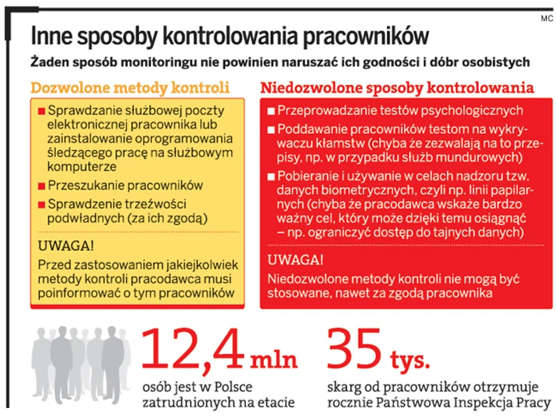 Według danych firmy informatycznej HDS co trzeci polski pracodawca sprawdza, w jaki sposób pracownik korzysta ze służbowych komunikatorów internetowych. Z kolei dwie na trzy firmy kontrolują jego pocztę elektroniczną. Coraz częściej jednak pracodawcy wręcz inwigilują swoich podwładnych, łamiąc przy okazji przepisy.