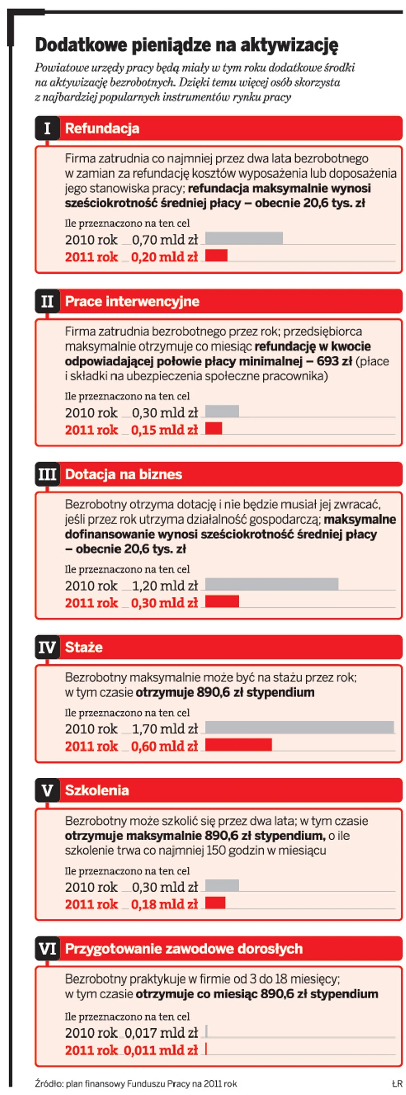 Dyrektorzy powiatowych urzędów pracy w 2011 roku mają na aktywizację bezrobotnych o 464 mln zł więcej, niż pierwotnie przyjął rząd jesienią ubiegłego roku w projekcie planu finansowego Funduszu Pracy. Mogą też ubiegać się o pieniądze z rezerwy Jolanty Fedak, minister pracy i polityki społecznej. Co więcej, pani minister zapowiada, że wystąpi do ministra finansów Jacka Rostowskiego o dodatkowe 1,5 mld zł na ten cel. Więcej osób skorzysta więc z dotacji na biznes, szkoleń czy stypendiów.