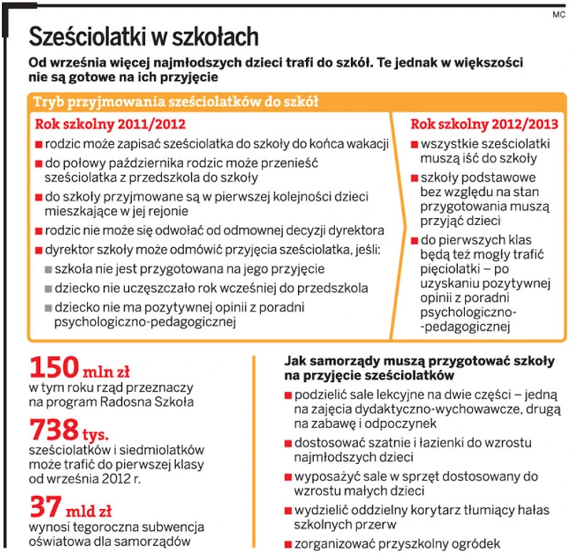Nawet gdy samorządy nie mają pieniędzy na przystosowanie szkół, nie martwią się, że te będą stały puste. Rodzice też coraz częściej nie patrzą na złe warunki panujące w szkołach, bo chcą, aby ich dzieci trafiły tam już teraz, a nie za rok, kiedy wszystkie sześciolatki i siedmiolatki będą się uczyć w pierwszych klasach. Największego boomu od września spodziewają się duże miasta.