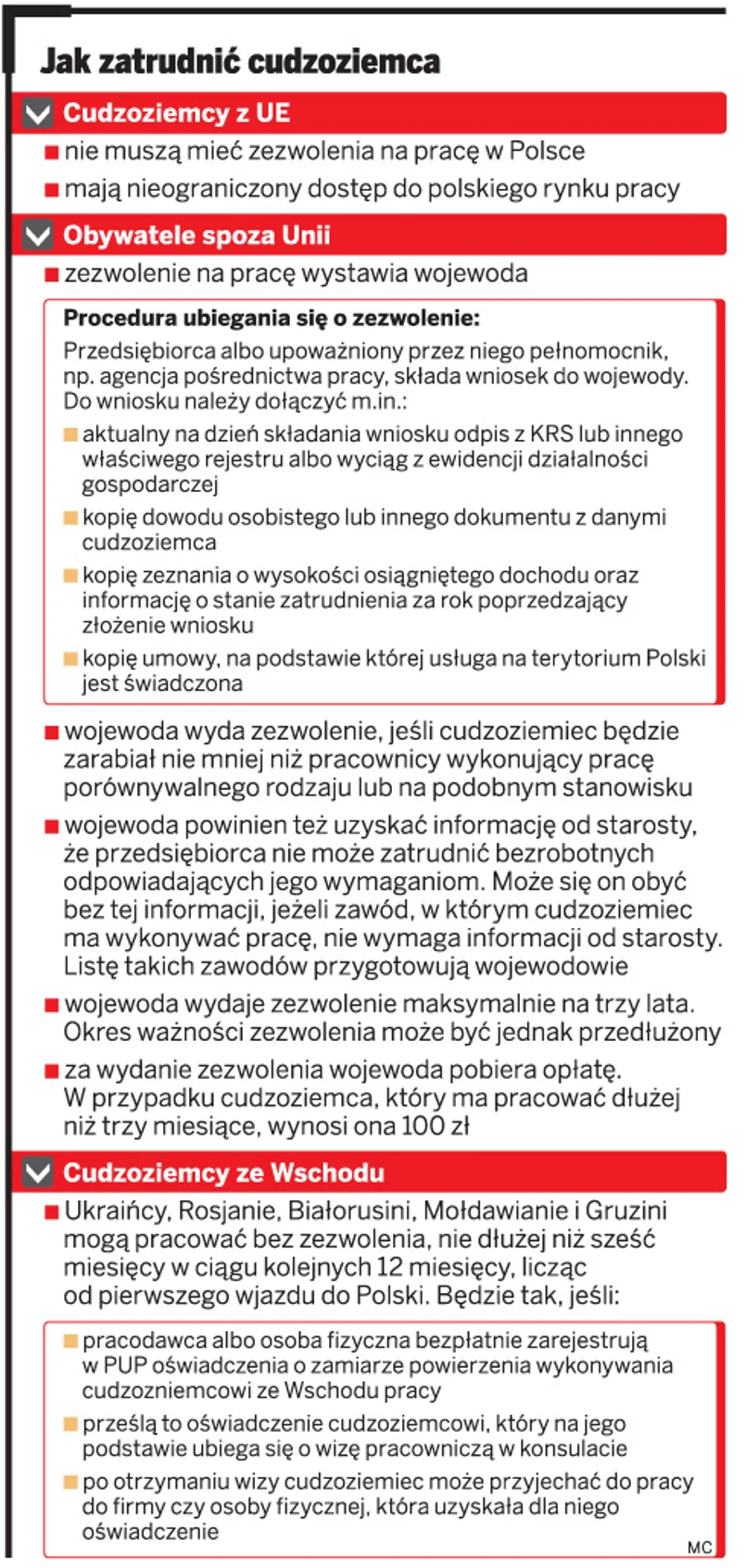 Projekt przewiduje, że firmy i osoby prywatne (na przykład rolnicy), którzy zdecydują się na zatrudnienie cudzoziemca spoza UE, będą musiały zażądać od niego ważnego dokumentu (wizy) uprawniającego do pobytu w Polsce. Potem muszą dokument skserować i kopię mieć u siebie przez cały okres jego zatrudniania. Inaczej będą im grozić surowe sankcje. Przede wszystkim finansowe. Już teraz, zgodnie z ustawą o promocji zatrudnienia, firma może za to zapłacić nawet 10 tys. zł. Na podstawie nowych przepisów będą jej groziły dodatkowe kary. Jeśli sąd nie będzie mógł ustalić czasu zatrudnienia i wysokości wynagrodzenia, to przyjmise, że trwało ono co najmniej trzy miesiące, a cudzoziemiec otrzymywał płacę minimalną.