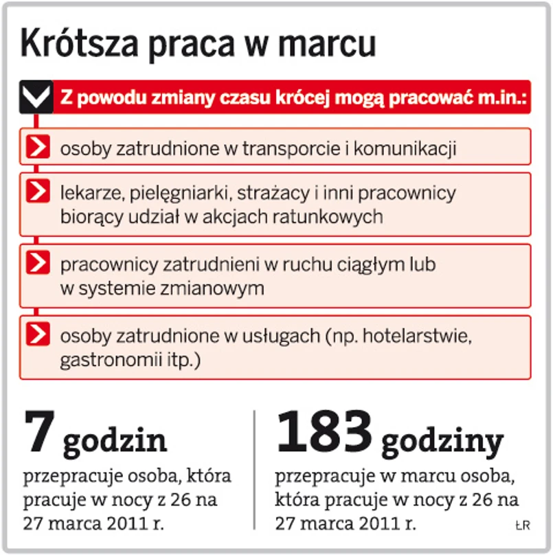 W związku ze zmianą czasu w najbliższą niedzielę wskazówki zegara przesuwamy z godz. 2 na 3. W związku z tym wszyscy podwładni wykonujący w tym czasie pracę będą w firmie godzinę krócej. Oznacza to, że pracownicy świadczący pracę na przykład od godz. 22 w sobotę 26 marca do 6 w niedzielę 27 marca przepracują siedem, a nie osiem godzin. Takie osoby nie wypracują zatem obowiązującego ich wymiaru czasu pracy. W marcu przepracują 183 godziny, choć powinni wykonywać pracę godzinę dłużej.