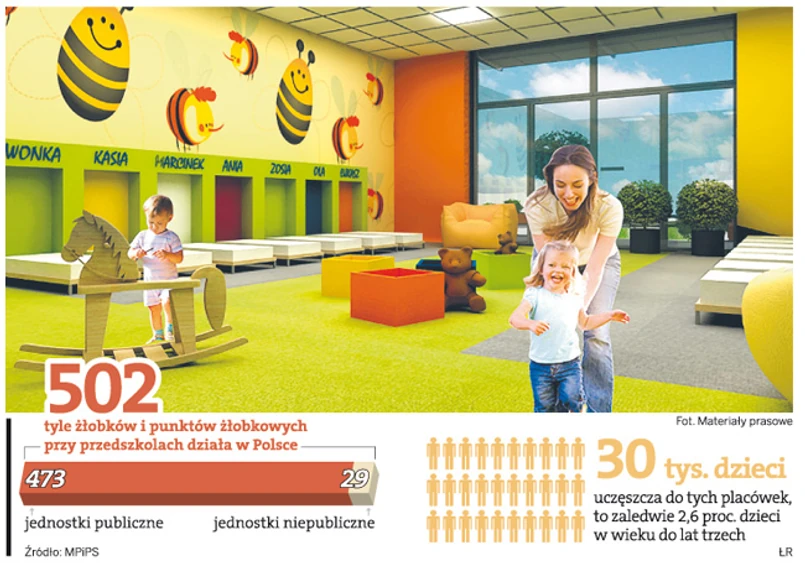W Polsce do żłobków uczęszcza 2,6 proc. z blisko półtoramilionowej populacji dzieci do lat 3. W Danii i Belgii na 100 dzieci przypada ponad 50 miejsc w żłobkach, we Francji i w Szwecji ponad 40. W krajach Europy Zachodniej ten odsetek średnio wynosi 30 proc. Według strategii lizbońskiej taki poziom Polska powinna osiągnąć do 2020 r. W ciągu najbliższych 9 lat powinno więc powstać ponad 400 tys. nowych miejsc opieki nad najmłodszymi. Z szacunków minister pracy Jolanty Fedak wynika, że do 2013 r. powstanie ponad 40 tys. nowych miejsc w żłobkach.