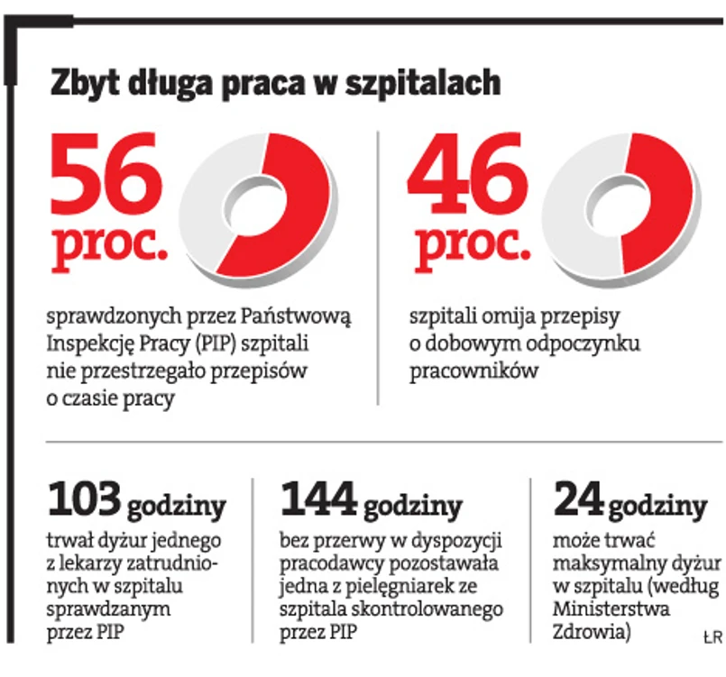 Podkreśla, że takie nieprawidłowości ujawniono w blisko połowie z 295 placówek medycznych skontrolowanych w ubiegłym roku przez PIP. W ciągu zaledwie dwóch lat ich liczba wzrosła aż sześciokrotnie. Zdarza się, że szpitale nie przestrzegają ani zaleceń resortu zdrowia, zgodnie z którymi dyżur medyczny może trwać maksymalnie 24 godz., ani przepisów, które przyznają pracownikom medycznym prawo do odpoczynku bezpośrednio po zakończeniu dyżuru.