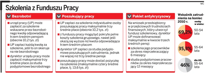 Od 1 lutego 2009 r. dyrektor PUP może pracownikowi, który ukończył 45 lat, zapłacić za szkolenie (na jego wniosek). Kwota ta odpowiada maksymalnie trzem średnim pensjom. Jedyny warunek, który zainteresowany musi spełnić, to zarejestrować się jako poszukujący pracy (jednocześnie może być zatrudniony). Tyle że starsi pracownicy również nie korzystają z takiej możliwości. W Rzeszowie i Grudziądzu w ubiegłym roku przeszkoliła się jedna taka osoba, w Warszawie – dwie (spośród 1868), w Sztumie żadna.