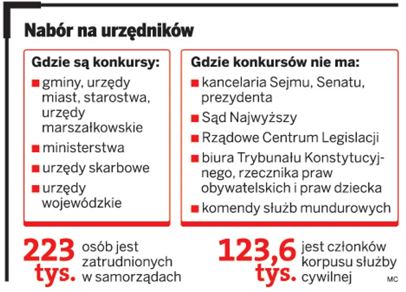 Dodatkowo przeciwni nowelizacji są także szefowie urzędów państwowych, którzy obecnie mogą zatrudniać pracowników na dowolnych zasadach. Tak jest np. w Kancelarii Sejmu, Senatu, Prezydenta, Rządowym Centrum Legislacji czy też regionalnych izbach obrachunkowych. Projekt nowelizacji zakłada jednak wprowadzenie w tych instytucjach ustawowych zasad przeprowadzania naboru.