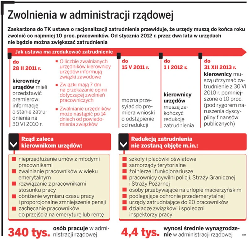 Jutro Trybunał Konstytucyjny (TK) rozstrzygnie, czy w urzędach rozpocznie się 10-proc. redukcja zatrudnienia. Jeśli ustawa o redukcji zatrudnienia będzie zgodna z konstytucją, zwolnienia ruszą we wrześniu. W razie uznania przepisów za niekonstytucyjne rząd przygotuje nową, poprawioną ustawę.