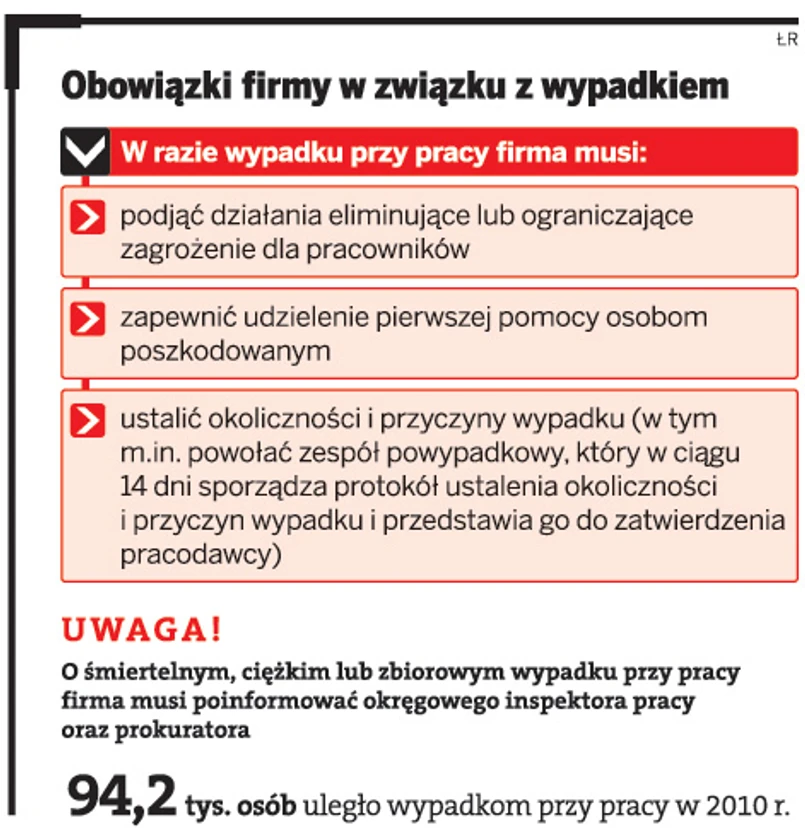 To tylko jeden z przykładów niezgodnego z prawem zachowania pracodawcy w sytuacji, gdy dochodzi do wypadku przy pracy. W ubiegłym roku Państwowa Inspekcja Pracy sprawdziła 7,6 tys. dokumentacji powypadkowych. W co piątym skontrolowanym zakładzie pracy, mimo jednoznacznych dowodów, członkowie zespołu powypadkowego nie wykazali naruszenia przepisów. Z kolei 37 proc. firm nie ustaliło wszystkich przyczyn wypadków.