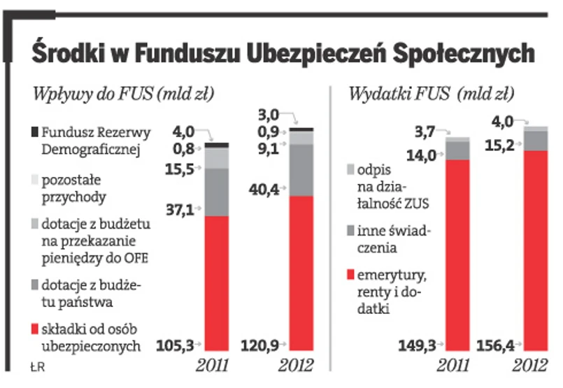 Wpływy ze składek do FUS nie wystarczają na opłacenie świadczeń, na przykład emerytur. Dlatego w planie finansowym FUS założono, że uzupełnieniem wpływów ze składek będzie nie tylko dotacja i refundacja wpłat przekazanych do otwartych funduszy emerytalnych, ale także środki pochodzące z Funduszu Rezerwy Demograficznej oraz kredytów bankowych. Łącznie ze wszystkich tych źródeł FUS w przyszłym roku otrzyma ponad 50 mld zł.