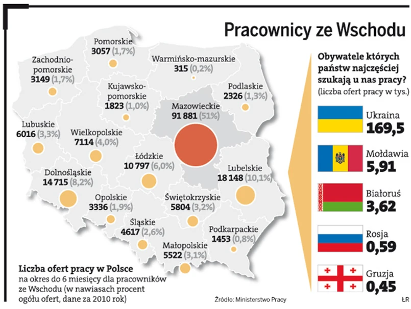 Jak wynika z sondy przeprowadzonej przez „DGP”, w tym roku gwałtownie wzrosło zainteresowanie polskich pracodawców siłą roboczą z Ukrainy, Białorusi, Rosji, Mołdawii oraz Gruzji. W ciągu pierwszych pięciu miesięcy tego roku w samej tylko Warszawie firmy zadeklarowały, że zatrudnią 13 tys. osób z tych krajów. To dwukrotnie więcej niż w tym samym okresie roku ubiegłego