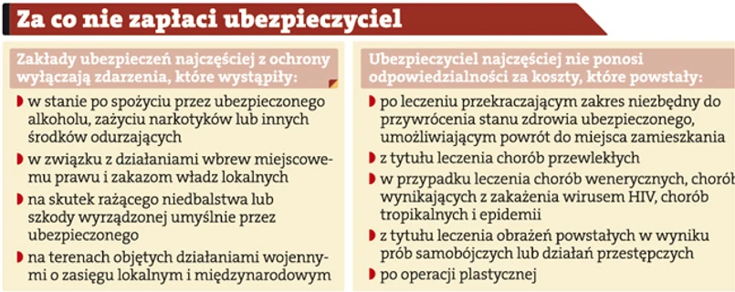 Warto pamiętać, że ubezpieczyciel ma prawo wskazać pewne sytuacje, w których nie udzieli pomocy, tzn. odmówi wypłaty odszkodowania. Jeżeli uważamy, że katalog takich wyłączeń jest zbyt duży, to powinniśmy zrezygnować z oferty i poszukać innego ubezpieczyciela. Na negocjowanie zmiany postanowień umowy o ubezpieczenie turystyczne nie ma co liczyć.
