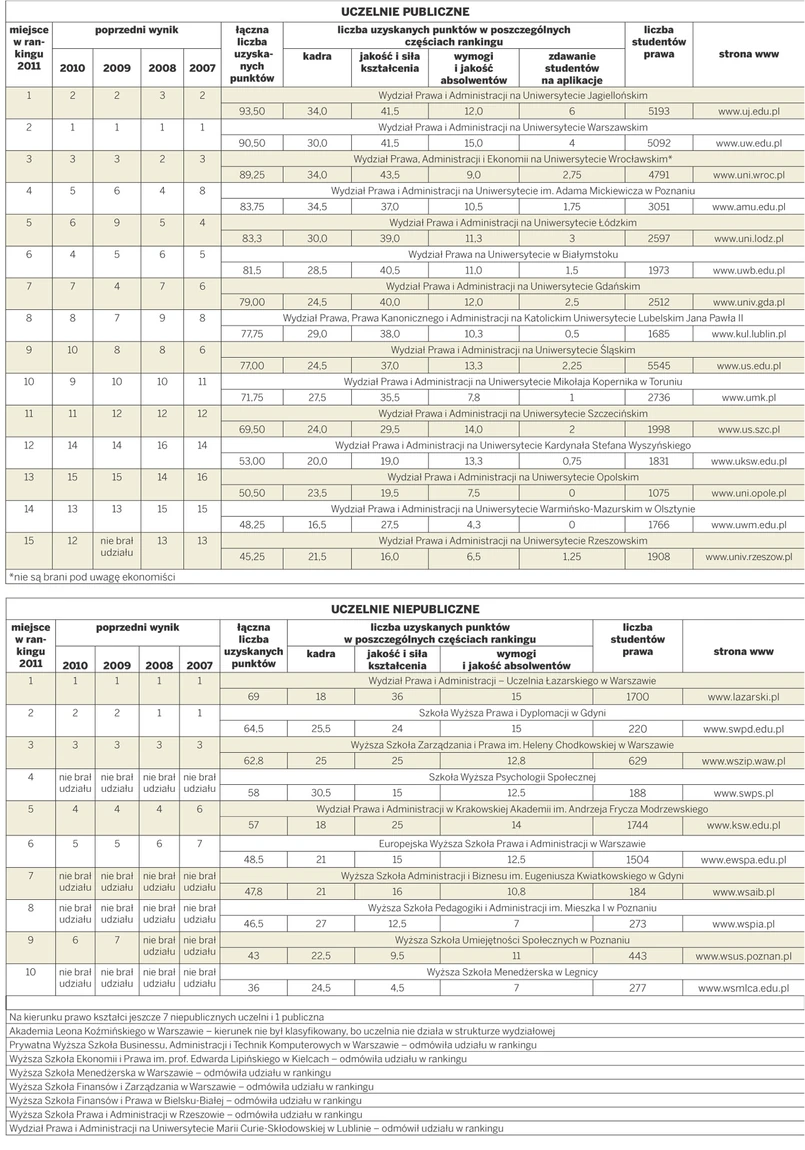 Tak jak w ubiegłych latach maksymalna liczba punktów, które można było uzyskać, wynosiła 100. Z tego 40 punktów za kadrę, 45 za jakość i siłę kształcenia oraz 15 za wymogi stawiane studentom i jakość absolwentów. Tym razem dodaliśmy jednak do punktacji zdawalność absolwentów na aplikacje prawnicze. Dotyczy to uczelni publicznych, bo w danych, które przygotowuje Ministerstwo Sprawiedliwości, uczelnie prywatne nie są licznie reprezentowane. Lider otrzymał 6 punktów, wicelider – 4, a uczelnia, która zajmuje 3. miejsce – 3 punkty. Kolejne szkoły dostają odpowiednio o 0,25 pkt mniej.